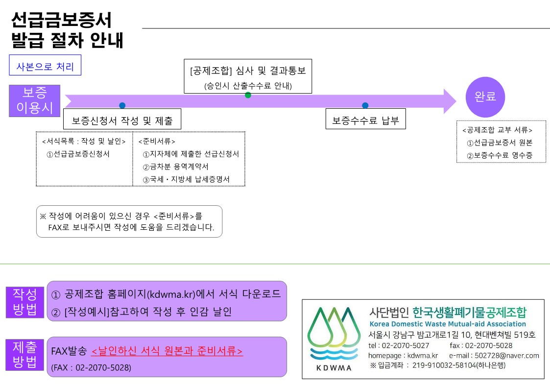 ※ 지자체에 제출하실 선금신청서를 조합으로 제출(이메일 또는 팩스) 하시면, 산출결과와 함께 보증신청서 작성하여 보내드립니다.