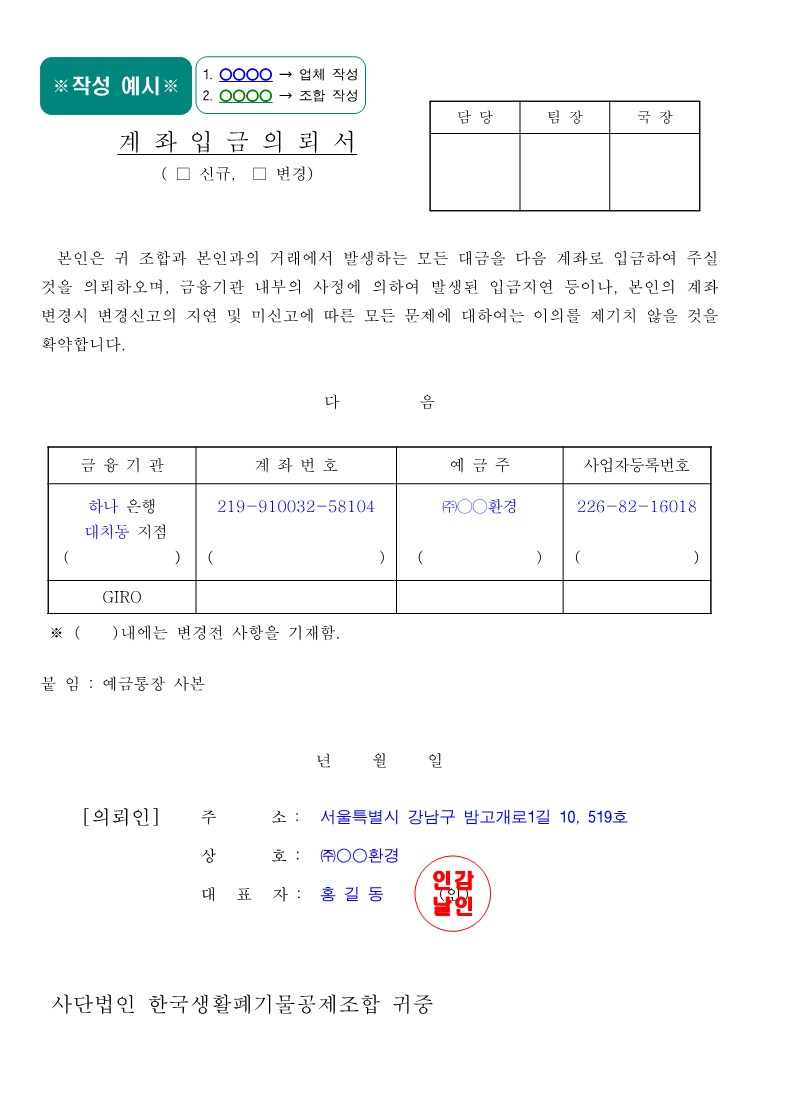 - 인감날인 : 법인인감 또는 조합에 제출한 인감신고서 상의 사용인감